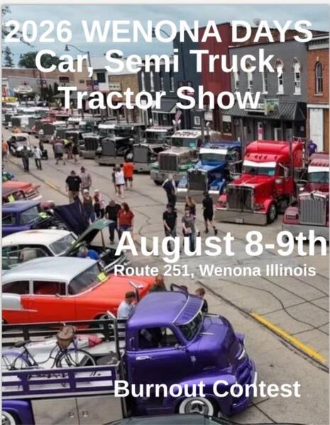 Saturday – Light Show will take place at the school 102 Elm Street Wenona from 5pm-10pm Fireworks @ 9pm. Awards for light show will be presented with Sundays truck show awards at 12pm